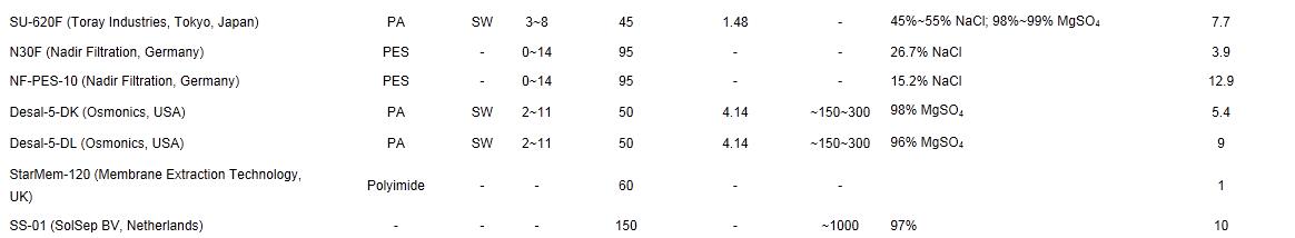 Trisep公司提供了多種不同截留分子量的納濾膜產品,主要包括TS80、TS40、XN45、UA60、SB90、SBNF.TS80是一款截留分子量在100~200 Da的聚酰胺類納濾膜,主要用于水質軟化;TS40是一款截留分子量在200~300 Da的聚哌嗪類納濾膜,主要用于食品、乳制品等其他工業(yè)應用;XN45膜截留分子量在500 Da,主要用于工業(yè)過程和低壓水純化;UA60截留分子量在1000~2000 Da,通常被認為是一種致密超濾膜或疏松納濾膜;SB90是一款高通量醋酸纖維素膜,主要用于經常會用到氯消毒的飲料行業(yè);SBNF是一款標稱截留分子量在1000~2000 Da的醋酸纖維素納濾膜,可用于水體的有機物和色度的去除.
