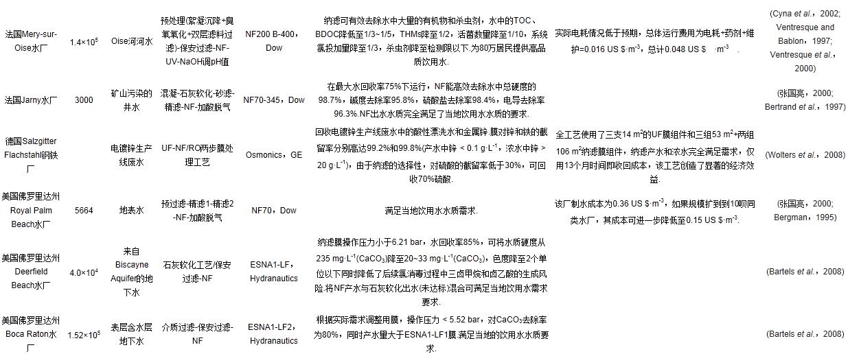 目前納濾膜在飲用水深度處理中已有較大規(guī)模的應用實例,且保持著快速強勁的增長勢頭.法國巴黎Mery-sur-Oise水廠在1999年建成了產水14×104 m3·d-1的納濾膜系統(tǒng),是世界上第一個大型納濾膜系統(tǒng),主要用于去除水中殘留的殺蟲劑和除草劑,并且可以向周邊80萬居民提供高品質的飲用水.法國東部Jarny水廠是第一個將高硫酸鹽高硬度的礦井水作為飲用水水源的納濾水廠,該廠采用NF70-345納濾膜對原水進行處理,產水的總硬度去除率達98.7%、電導去除率96.3%,該廠每日產水3000 m3完全滿足了周邊用戶的用水需求.經過9年時間的連續(xù)運行,盡管納濾膜發(fā)生了不可逆膜污染導致通量衰減程度達到35%~40%,但整體仍處于良好的運行狀態(tài).20世紀末納濾膜應用在美國迎來了爆發(fā)式增長,1992—1996年美國的納濾裝置以500%的速度增長,在美國已有超過100×104 m3·d-1規(guī)模的納濾軟化水裝置在運轉.以美國佛羅里達州為例,由于當地的飲用水水源多為淺層地下水,普遍存在鹽度、硬度和某些金屬離子以及有機物含量大幅超標的問題.為滿足日益嚴格的用水水質要求,目前已有多座城市的水處理廠采用納濾和反滲透工藝逐步替代常規(guī)的石灰軟化和離子交換水處理工藝.同時,采用膜法軟化水質還具有無污泥產生、無需再生、操作簡便以及節(jié)省占地等優(yōu)點,在投資建設和運行維護費用方面與常規(guī)方法相近.1996年建成的Hollywood水廠是當時佛州最大的納濾水廠,產水量達6.8×104 m3·d-1(18 MGD),為Hollywood市超過14萬居民提供飲用水,建設投資超過1700萬美元.此外,Deerfield Beach市和Boca Raton市分別于2003和2004年建成投產了4.0×104 m3·d-1(10.5 MGD)和15.2×104 m3·d-1(40 MGD)的基于納濾的飲用水處理系統(tǒng),主要用于去除原水中的硬度、色度和消毒副產物(三鹵甲烷、鹵乙酸等).位于Fort Lauderdale市的Peele-Dixie水處理廠和Jupiter鎮(zhèn)水處理廠分別采用了供水量達到4.5×104 m3·d-1(12 MGD)和5.5×104 m3·d-1(14.5 MGD)的納濾膜工藝,也取得了良好的處理效果.我國臺灣高雄在2007年投運一套產水量27×104 m3·d-1的納濾水廠,主要目的是去除水中的氨氮、消毒副產物等污染物質,是目前全球最大的納濾凈水系統(tǒng).
