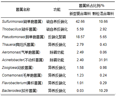 另外, 由表 2可見, 兩系統(tǒng)中與除磷作用有關(guān)的微生物有Pseudomonas、Aeromonas和Acinetobacter.從兩系統(tǒng)內(nèi)具有除磷功能微生物的總量對比可以看出, 顆?;旌咸盍戏磻?yīng)器內(nèi)的生物除磷作用大于新型復(fù)合填料, 表明該系統(tǒng)內(nèi)的生物除磷作用相對更多一些.同時根據(jù)2.2.2節(jié)的分析, 新型填料系統(tǒng)內(nèi)的化學(xué)除磷作用相對更強, 這會使得系統(tǒng)內(nèi)的總磷濃度得以迅速降低, 因此推測新型填料表面不動桿菌屬Acinetobacter的含量較小可能與之有關(guān).此外, 兩系統(tǒng)內(nèi)還存在著不同比例的可能具有反硝化聚磷功能的假單胞菌屬, 特別是新型填料, 這也在一定程度上提高了系統(tǒng)的脫氮除磷能力。