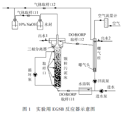 進(jìn)水和回流水分別采用蠕動(dòng)泵加壓,兩者合流進(jìn)入EGSB 反應(yīng)器?;亓魉占狡貧庵鶅?nèi),通過給曝氣柱內(nèi)回流水曝氣的方式來給顆粒污泥床供氧,并通過控制曝氣柱內(nèi)曝氣量來控制EGSB 反應(yīng)器內(nèi)溶解氧量。對(duì)進(jìn)出水氧化還原電位(ORP)進(jìn)行監(jiān)測(cè)以調(diào)節(jié)曝氣量,進(jìn)而控制EGSB 反應(yīng)器內(nèi)的氧化還原狀態(tài)。