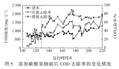 查閱大量文獻(xiàn)資料,分析表明此時(shí)的微氧顆粒污泥菌群中降解這些毒性污染物質(zhì)的菌群不存在或者說他們的活性不夠強(qiáng),可能是他們有特殊的營(yíng)養(yǎng)需求,其中無機(jī)碳營(yíng)養(yǎng)是需要重點(diǎn)考慮的(各種污染物質(zhì)降解菌之間會(huì)競(jìng)爭(zhēng)無機(jī)碳源)。接下來給反應(yīng)器中添加無機(jī)碳營(yíng)養(yǎng)物———碳酸氫鈉(說明:不是為了調(diào)節(jié)pH,事實(shí)上添加碳酸氫鈉后反應(yīng)器內(nèi)pH也沒有出現(xiàn)明顯變化),分析COD 去除率的變化情況,具體見圖5。