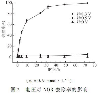 1)在低電壓條件下,NOR 去除效果良好,在水溶液體系中,NOR 的最低直接降解電壓為 1. 3 V。