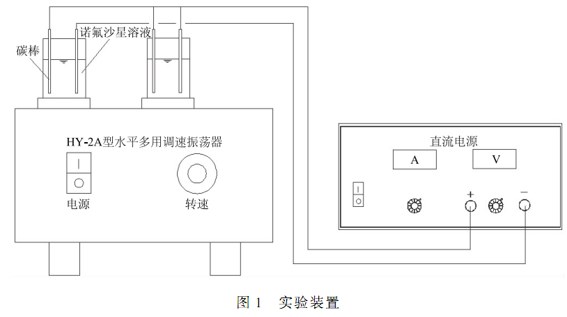 實驗裝置如圖 1 所示,裝置主要由直流電源、反應器、電極、振蕩器等組成。 圓柱形反應器直徑 7 cm,有效容積為 250 mL(含反應液體 200 mL) ;在反應器頂蓋處設置直徑 6 mm 孔,用于安裝電極;陽極及陰極材料為石墨。 電極形狀為圓柱形,電極尺寸為 ?6 mm × 150 mm,電極間距為 5. 5 cm。 實驗過程中,通過導線將電極與直流電源相連接。 實驗中,控制振蕩器的振蕩速度 100 r·min - 1,實現(xiàn)反應器中液體的均勻性。 采用電化學工作站,利用線性循環(huán)伏安法確定反應系統(tǒng)的最佳電壓。