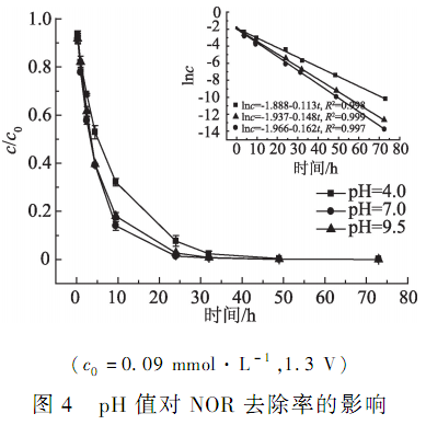 在反應器內加入200 mL NOR 水溶液(含20 mmol·L - 1Na2 SO4 電解質) ,開啟水平調速振蕩器及直流電源開關,使溶液通電的同時混合充分均勻。 分別于 0、0. 3、1、2. 5、4. 5、9. 5、24、32、49 及 73 h 取樣,測定NOR 剩余濃度。 反應過程分別在不同電壓(0、0. 5、1. 3 V)不同 NOR 濃度(0. 03、0. 06、0. 09 mmol·L - 1) 、不同 pH 值(4. 0、7. 0、9. 0)及不同腐殖酸濃度(5. 0、10. 0 mg·L - 1)等條件下進行,每組實驗設置 3 個平行。 為排除光照對實驗的影響,實驗過程中反應器作避光處理。