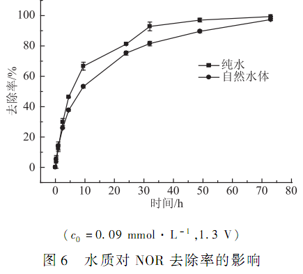不同水質條件下,NOR 的降解效果如圖 6 所示。 在地表水體中,因腐殖質等天然有機物的影響,NOR的去除率略低于純凈水體系,尉小旋等在諾氟沙星的光化學降解實驗中也得出了類似結論;但隨著反應的不斷進行,水中雜質的干擾作用逐漸減弱,在地表水體中,當 NOR 初始濃度為 0. 09 mmol·L - 1時,在1. 3 V 條件下反應 70 h 后,NOR 去除率可達到 95%以上。