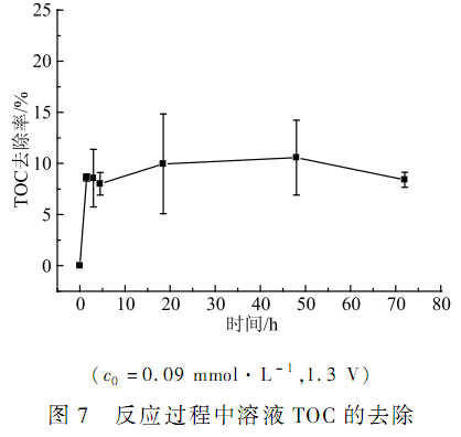 反應過程中溶液的 TOC 去除率變化曲線如圖 7 所示。 在外加 1. 3 V 電壓條件下,經 20 h 反應后,水樣的 TOC 去除率僅為 10%左右,且反應時間延長至 70 h,TOC 的去除率并無明顯提高( P > 0. 05) ,可見,在低電壓條件下,NOR 的去除主要是轉化而非礦化過程,大量有機中間產物仍殘留在反應體系中。 韓寧等在研究 Fenton 及 UV-Fenton 法去除污水中 NOR 的過程中發(fā)現(xiàn),TOC 的去除率最大只能達到 50% 左右,因此溶液中也存在著大量的有機中間產物。