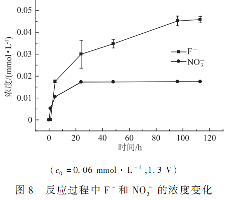 在 NOR 初始濃度 c0 = 0. 06 mmol·L - 1,外加電壓 1. 3 V 條件下,由于 NOR 分子中 N 和 F 元素被部分脫除,反應體系中檢出一定濃度 F -和 NO -,如圖 8 所示。 經 24 h 反應后,溶液中 F -和 NO -濃度顯著增加(P < 0. 05) ,分別為 0. 030 和 0. 017 mmol·L - 1,隨著反應時間的不斷延長,NO -3 濃度基本維持不變,F -濃度則逐漸增加,至 110 h,濃度維持在 0. 046 mmol·L - 1左右。 CHEN 等在研究光催化降解 NOR 實驗中,均檢測到 F -的生成。 可能的反應途徑是 OH -取代 F -導致 F -的脫落。 NO -3 的檢測尚未有文獻報道,相關分析需進一步的研究。