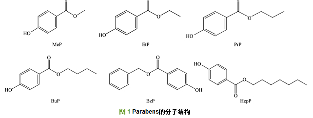 本研究共選擇了6種parabens作為目標(biāo)物, 分別為:對(duì)羥基苯甲酸甲酯(MeP)、對(duì)羥基苯甲酸乙酯(EtP)、對(duì)羥基苯甲酸丙酯(PrP)、對(duì)羥基苯甲酸丁酯(BuP)、對(duì)羥基苯甲酸芐酯(BzP)、對(duì)羥基苯甲酸庚酯(HepP), 分子結(jié)構(gòu)如圖 1所示.