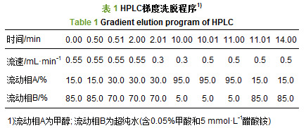 采用液相色譜質(zhì)譜聯(lián)用儀進(jìn)行檢測(cè), 儀器型號(hào)為安捷倫LC1290-MS/MS6430.色譜柱型號(hào)為ZORBAX RRHD Eclipse Plus C18(100×2.1 mm, 1.8 μm), 柱溫為30℃, 流動(dòng)相為甲醇和含0.05%甲酸和5 mmol·L-1醋酸銨的超純水溶液(取5 mmol·L-1, 0.3854 g醋酸銨, 500 μL甲酸溶解在1 L超純水中), 流速為0.5 mL·min-1, 梯度洗脫程序如表 1所示.進(jìn)樣量為5 μL.質(zhì)譜選擇Dynamic MRM模式, 特征離子和出峰時(shí)間分別為:MeP(151 > 92, 1.21 min)、EtP(165 > 92, 1.41 min)、PrP(179 > 92, 1.58 min)、BuP(193 > 92, 1.83 min)、BzP(227 > 92, 1.80 min)、HepP(235 > 92, 2.63 min)、13C6-MeP(157 > 98, 1.20 min)、13C6-EtP(171 > 98, 1.40 min)、13C6-PrP(185>98, 1.61 min)和13C6-BuP(199 > 98, 2.0 min), 電噴霧電離(ESI), 毛細(xì)管電壓為-3 500 V, 噴霧器壓力為-40 V, 去溶劑氣溫度為300℃.