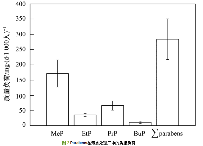 污水處理廠中檢出率較高的4種parabens及總parabens的質(zhì)量負(fù)荷由parabens在進(jìn)水中的質(zhì)量濃度、每日處理量和污水處理廠的服務(wù)人口數(shù)計(jì)算得到, 結(jié)果如圖 2所示. MeP、PrP、EtP和BuP的質(zhì)量負(fù)荷分別為172、66.3、35.3和11.1 mg·(d·1 000人)-1, 總parabens的質(zhì)量負(fù)荷達(dá)到284 mg·(d·1 000人)-1.本文的研究結(jié)果與美國(guó)[46.3~176 mg·(d·1 000人)-1]和印度[4.1~140 mg·(d·1 000人)-1]的研究結(jié)果相似, 卻遠(yuǎn)低于丹麥[2 750 mg·(d·1 000人)-1]和法國(guó)[30 400 mg·(d·1 000人)-1的研究數(shù)據(jù).這與污水處理廠的服務(wù)人口數(shù)及污水來源有關(guān).