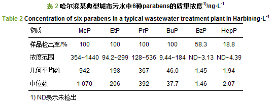 (1) 通過對(duì)哈爾濱某典型城市污水中6種parabens的檢測(cè)發(fā)現(xiàn), parabens的污染較為普遍, MeP、EtP和PrP是主要的目標(biāo)物, 與發(fā)達(dá)國(guó)家相比, 其污染程度較輕.