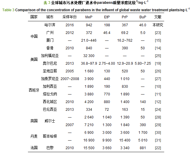 通過與國(guó)內(nèi)外其他相似的研究結(jié)果對(duì)比(見表 3), 可以看出, MeP、EtP和PrP在所有國(guó)家的城市污水中也都是主要的目標(biāo)物, 說明它們的生產(chǎn)和使用在不同國(guó)家具有相似性.從單一目標(biāo)物的對(duì)比可以看出, 不同國(guó)家的檢出質(zhì)量濃度具有較大的差異.哈爾濱城市污水中MeP的質(zhì)量濃度要高于中國(guó)廣州、香港、廈門、美國(guó)奧爾巴尼和西班牙巴倫西亞等地的污水中的檢出質(zhì)量濃度, 卻遠(yuǎn)低于美國(guó)加利福尼亞、西班牙、英國(guó)威爾士、丹麥哥本哈根、德國(guó)萊比錫城和法國(guó)巴黎等地的污水中的檢出質(zhì)量濃度.與MeP相似, 其他幾種parabens也有類似的結(jié)果.綜上所述, 中國(guó)城市污水中parabens的檢出質(zhì)量濃度較低, 但是在中國(guó)食品、化妝品和藥品中檢測(cè)到的parabens的質(zhì)量濃度整體上要高于美國(guó). Liao等對(duì)中國(guó)13大類282個(gè)食品樣品進(jìn)行了檢測(cè), 發(fā)現(xiàn)99%的食品中含有parabens, MeP、EtP和PrP也是主要的目標(biāo)污染物, 食品中Σparabens質(zhì)量濃度的中位數(shù)為3.09 ng·g-1, 大于美國(guó)食品中parabens的質(zhì)量濃度(0.92 ng·g-1); 通過對(duì)美國(guó)和中國(guó)藥品中parabens的質(zhì)量濃度結(jié)果進(jìn)行對(duì)比發(fā)現(xiàn), 中國(guó)藥品中Σparabens的質(zhì)量濃度比美國(guó)高一個(gè)數(shù)量級(jí); 而中國(guó)化妝品中parabens的濃度水平與美國(guó)相當(dāng).