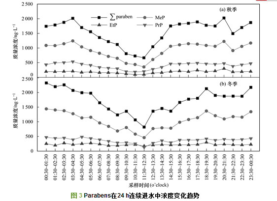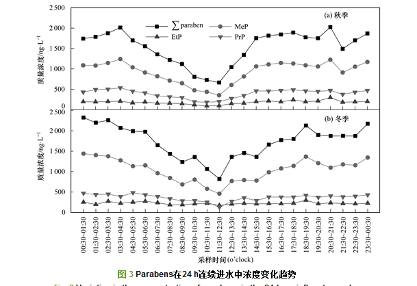 通過對(duì)秋冬兩季城市污水處理廠24 h的進(jìn)水進(jìn)行分析, 對(duì)parabens質(zhì)量濃度的日變化趨勢(shì)進(jìn)行了深入研究, 結(jié)果如圖 3所示.從中可以看出, 秋冬兩季主要目標(biāo)物和總parabens質(zhì)量濃度的日變化規(guī)律均相同, 24 h的質(zhì)量濃度存在較大的變化, 秋冬兩季質(zhì)量濃度最低值都出現(xiàn)在11:30~12:30之間, 此時(shí)秋冬季parabens的總質(zhì)量濃度分別為664ng·L-1和819ng·L-1; 秋冬季質(zhì)量濃度最高點(diǎn)分別出現(xiàn)在晚間20:30~21:30之間和凌晨00:30~01:30之間, 此時(shí)parabens的質(zhì)量濃度分別為2 030ng·L-1和2 330ng·L-1, 分別是最低質(zhì)量濃度的3.05倍和2.84倍, 由此可知秋冬季節(jié)進(jìn)水中parabens的最高排放時(shí)期有一定的差異, 但是秋冬季節(jié)的日變化趨勢(shì)差異不大.污水中parabens的質(zhì)量濃度日變化趨勢(shì)與污水廠覆蓋區(qū)域人們的日常生活有關(guān), 如洗漱活動(dòng), 但是污水從居民家的排放到污水處理廠需要一定的時(shí)間.從圖 3中可以看出, 無論是秋季還是冬季, parabens質(zhì)量濃度較低的時(shí)間大概有8~9 h, 正好與人們?nèi)粘I钪械乃X時(shí)間保持一致, 也證明了城市污水中parabens的污染主要是人們的日常生活導(dǎo)致的.本文對(duì)24 h進(jìn)水中parabens的質(zhì)量濃度日變化趨勢(shì)的研究結(jié)果為城市污水處理系統(tǒng)研究提供了重要參考, 特別是對(duì)水樣的采集時(shí)間的合理設(shè)置提供了參考.因此, 在進(jìn)行城市污水處理廠運(yùn)行效果的相關(guān)研究中, 針對(duì)進(jìn)水的采集, 最好采集不同時(shí)間段的水樣進(jìn)行混合, 否則可能由于單次采樣帶來較大誤差, 例如可以在24 h內(nèi), 每隔幾個(gè)小時(shí)進(jìn)行一次水樣采樣, 然后混合為一個(gè)樣品, 或者根據(jù)24 h內(nèi)污染物濃度的日變化趨勢(shì), 選擇濃度的高峰或者低峰為節(jié)點(diǎn), 按照污水處理廠各個(gè)污水處理單元的水力停留時(shí)間進(jìn)行采樣.