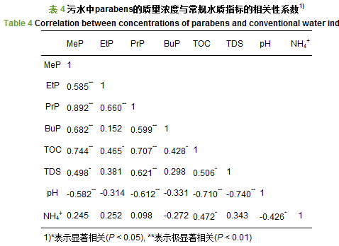 為了研究常規(guī)水質(zhì)指標(biāo)與parabens質(zhì)量濃度的關(guān)系, 本研究對(duì)污水樣品中的5種常規(guī)水質(zhì)指標(biāo)進(jìn)行檢測(cè), 它們與4種檢出率為100%的parabens的質(zhì)量濃度的相關(guān)性結(jié)果見表 4所示. BuP與EtP沒有相關(guān)性, MeP、EtP與PrP兩兩之間均具有極顯著相關(guān)性(P < 0.01), 相關(guān)系數(shù)在0.585到0.892之間, 說明它們具有相同的來源.在我國(guó)的食品、藥品和洗護(hù)用品的研究中, 也發(fā)現(xiàn)了它們之間的顯著相關(guān)性[16~18]. TOC與EtP和BuP具有顯著相關(guān)(P < 0.05), 相關(guān)系數(shù)分別為0.465和0.428;與MeP和PrP具有極顯著相關(guān)(P < 0.01), 相關(guān)系數(shù)分別為0.744和0.707;整體而言, TOC與MeP、EtP、PrP和BuP均具有顯著的正相關(guān)性, 說明隨著污水中MeP、EtP、PrP和BuP的質(zhì)量濃度增高, TOC的含量也變大. TDS與PrP具有極顯著相關(guān)(P < 0.01), 相關(guān)系數(shù)為0.621, 與MeP具有顯著相關(guān)(P < 0.05), 相關(guān)系數(shù)為0.498. pH與MeP和PrP具有極顯著相關(guān)(P < 0.01), 相關(guān)系數(shù)分別為-0.582、-0.612和0.804, 即pH與MeP和PrP成負(fù)相關(guān).