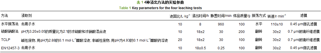 本文采用的4種浸出方法分別是HJ557-2009-固體廢物-浸出毒性浸出方法-水平振蕩法, HJT299-2007-固體廢物-浸出毒性浸出方法-硫酸硝酸法, 美國環(huán)保署(SUEPA)方法(TCLP)和歐盟的EN12457-3. 4種浸出方法的具體操作條件見表 1.