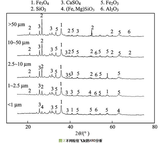 對于不同粒徑飛灰顆粒使用X射線熒光光譜分析儀(ZSX100e)分析主要成分見表 2.使用X射線衍射(PRO/MPD)分析不同粒徑的礦物相, 見圖 2.飛灰的主要成分包括Fe2O3、Al2O3、CaO、SiO2、SO3、P2O5、MgO和K2O.其中SiO2的含量是隨著粒徑的增大而增大的, 而Fe2O3、Al2O3、CaO、MgO的含量則隨粒徑的增大呈現(xiàn)出減小的趨勢.