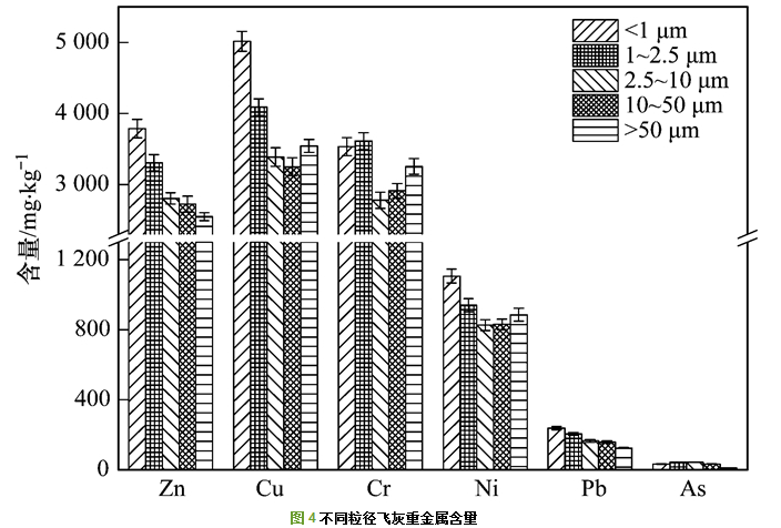 由圖 4可以看出, 飛灰中重金屬Zn和Pb的含量隨著粒徑的增加而降低, 而Cu、Cr、Ni和As的含量則表現(xiàn)為隨粒徑的增加先下降后上升的趨勢.這是因?yàn)榱叫〉娘w灰比表面積大, 更容易富集高濃度的重金屬.結(jié)合顆粒物形成機(jī)理分析:大粒徑飛灰主要是由于污泥焚燒過程中礦物質(zhì)破碎, 熔融形成; 小粒徑的顆粒物主要是由重金屬元素均相成核以及異相凝結(jié)形成, 在這個(gè)冷凝過程中, 重金屬附著在大顆粒的飛灰上.如圖 3中飛灰形貌, 大粒徑的飛灰容易吸附小粒徑的飛灰顆粒, 所以在>50 μm粒徑段出現(xiàn)重金屬含量升高的現(xiàn)象.