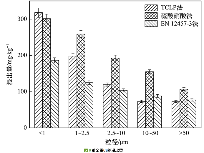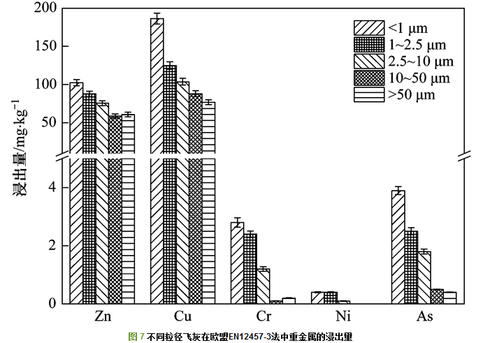 (1) 飛灰中重金屬Cu和Zn的含量及不同浸出方法中的浸出量都較高, 不同重金屬含量隨粒徑的增加而降低, 因?yàn)榱叫〉娘w灰比表面積大, 更容易富集高濃度的重金屬.重金屬Cu、Cr、Ni和As的含量在最大粒徑段(>50 μm)略有增加, 主要是因?yàn)榇罅斤w灰容易吸附小粒徑飛灰顆粒.