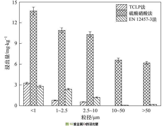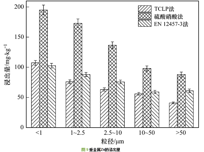 圖 5~7為不同粒徑飛灰在不同浸出方法中的重金屬浸出量.其中Pb的浸出量低于ICP-OES的最低檢測限, As的浸出量在TCLP法中的浸出量也低于最低檢測限, 所以在圖中未畫出.在不同的浸出方法中, 重金屬Zn和Cu的浸出含量都較高, 明顯高于其他重金屬, 其中, 在TCLP法浸出毒性中<1 μm粒徑段的浸出含量最高, 分別為107.34 mg·kg-1和318 mg·kg-1.在不同的浸出方法中, 隨著粒徑的增加, 重金屬的浸出量逐漸減少, 這與飛灰中重金屬總量隨粒徑的變化趨勢一致.