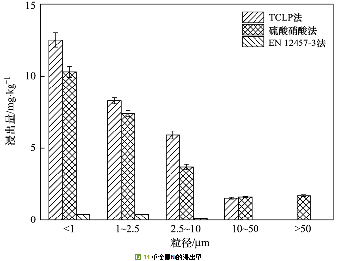 (2) 在利用HJ557-2009-水平振蕩法模擬地表水對不同粒徑飛灰的侵蝕時(shí), 重金屬的浸出量在安全范圍以內(nèi).重金屬Cu、Zn和Ni在TCLP和硫酸硝酸法中的浸出量要明顯高于在歐盟EN12457-3中的浸出量。