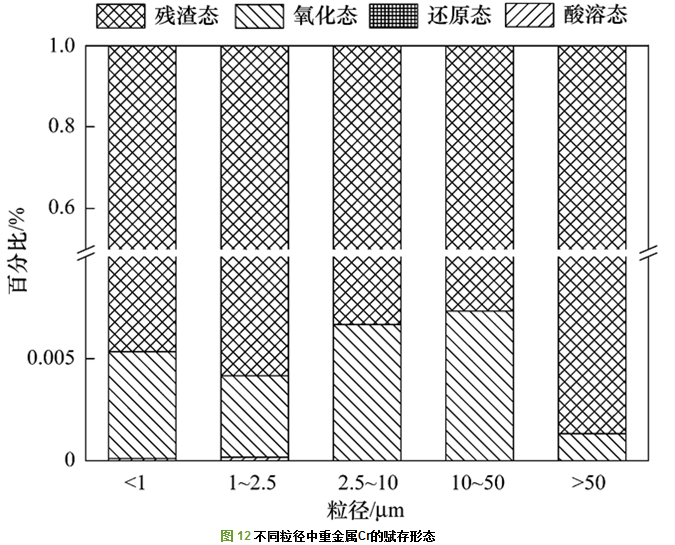而重金屬Cr則表現(xiàn)為在翻轉(zhuǎn)振蕩法中的浸出量明顯高于其他兩種方法.分析原因?yàn)楦亟饘貱r的賦存形態(tài)有關(guān).對不同粒徑飛灰采用歐共體提出的連續(xù)四步提取法(BCR)分析如圖 12.可以看出, Cr的殘?jiān)鼞B(tài)含量達(dá)到了99%以上, 所以在酸溶態(tài)下的冰醋酸溶液中的含量為0.又因TCLP法的浸取液為醋酸溶液, 所以重金屬Cr在TCLP方法中的浸出含量比較低.