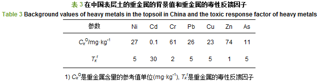 式中, k是重金屬的種類, Ck是重金屬的含量(mg·kg-1), CkO是重金屬濃度的背景值(mg·kg-1), O是重金屬的數(shù)量, 評估參考值采用工業(yè)化之前的表層土中重金屬最高的背景值.具體數(shù)值見表 3.