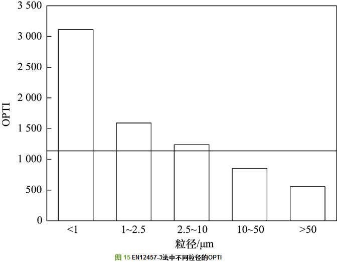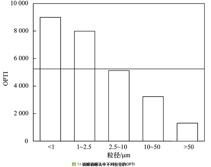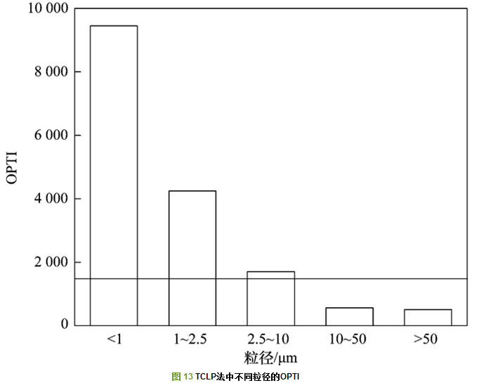從圖 13~15中可以看出, 隨著粒徑的減小, 飛灰的毒性增強(qiáng), 并且在TCLP法和硫酸硝酸法中的毒性遠(yuǎn)大于歐盟EN12457-3中的毒性.其中的橫線部分代表了未經(jīng)分級的原樣飛灰的綜合毒性, 在TCLP法, 硫酸硝酸法, 歐盟EN12457-3法中的OPTI值分別是:1 512.24、5 162.37和1 159.22.從圖 13~15中可以看出, 粒徑段為10~50 μm和>50 μm的飛灰的OPTI值明顯在原樣飛灰的OPTI值之下.所以, 將飛灰的粒徑分成兩部分:大于10 μm和小于10 μm, 可以看出原樣飛灰的OPTI值介于兩者之間.所以可以得出結(jié)論, 小于10 μm的飛灰更具有毒性, 危害性更大.因此, 應(yīng)該根據(jù)不同飛灰的粒度來考慮飛灰的資源化利用.