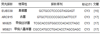 本研究采用4種寡核苷酸熒光探針對(duì)厭氧顆粒污泥中特定的微生物種群進(jìn)行定量分析, 探針信息見表 1.樣品的預(yù)處理則參考了文獻(xiàn)[14, 15]的方法.